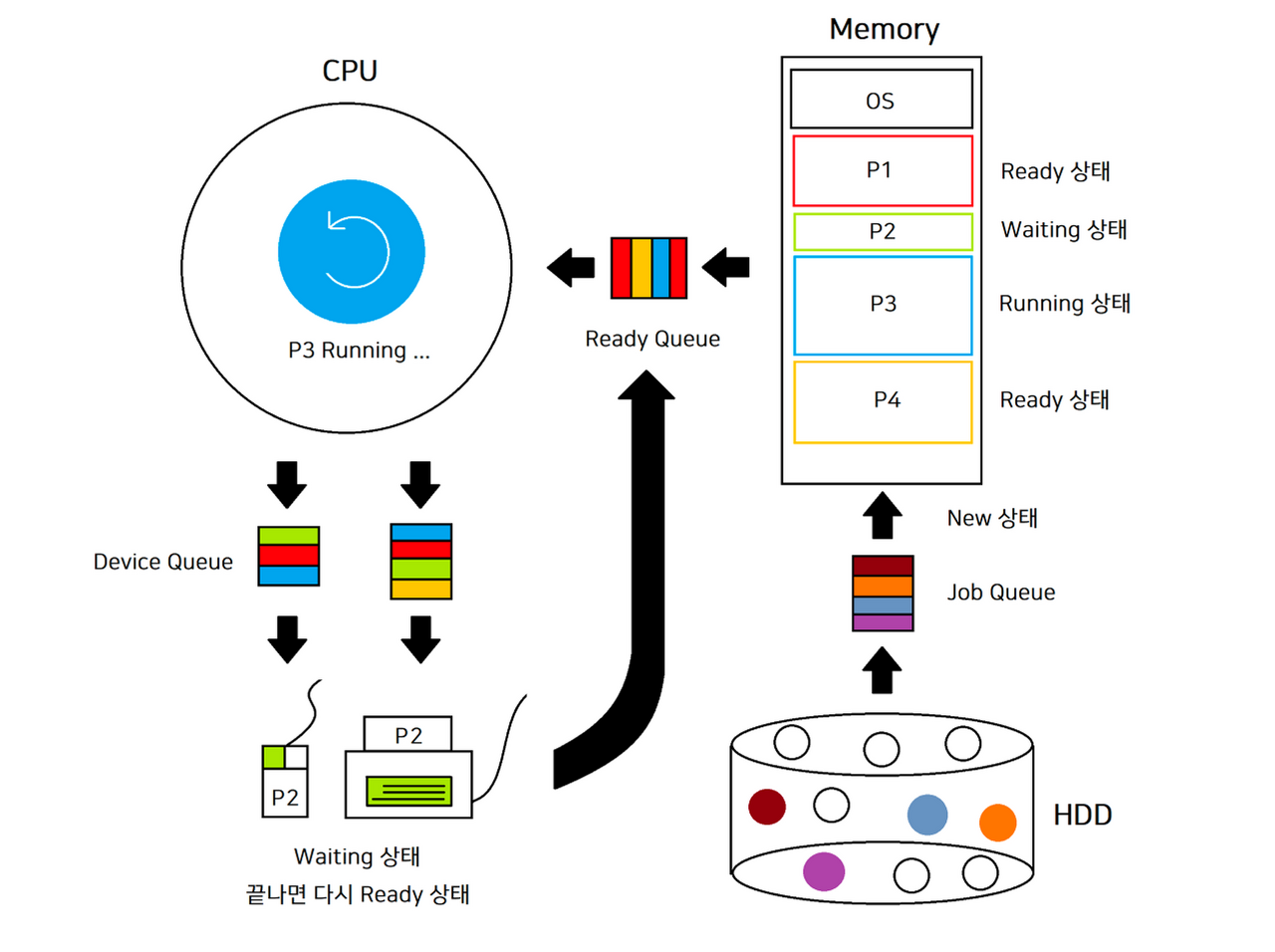 1) Job Queue : HDD에 있던 프로그램들이 메모리에 올라올 때, 만약 메인 메모리가 가득 찼더나 CPU가 다른 작업을 수행 중이라면 메모리에 올라오기 전에 어느정도 기다려야하는데 HDD의 프로그램들이 잠시 기다리는 곳을 Job Queue라고 한다.