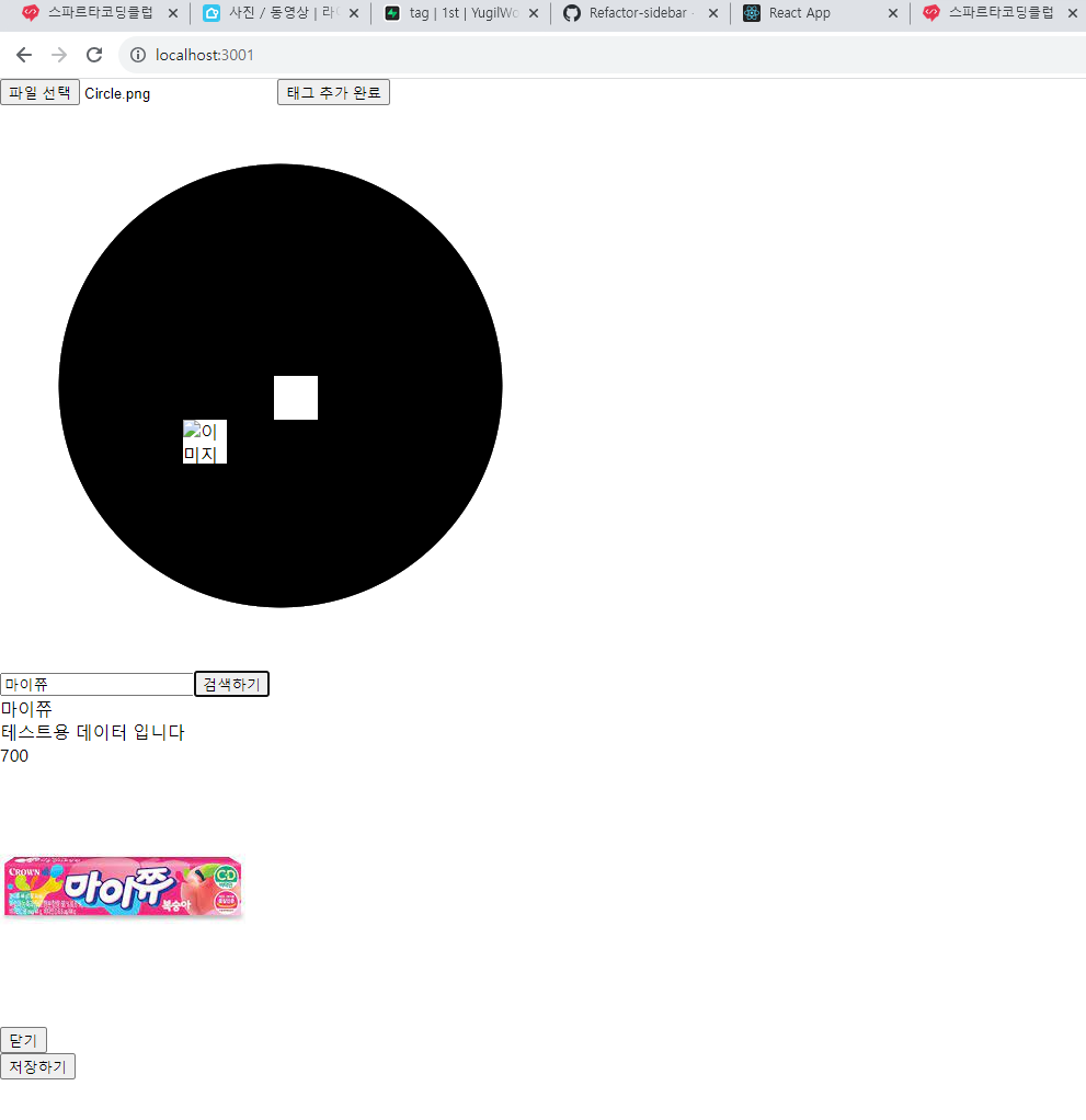 그리고 또 어제에 이어서 이미지를 넣었을 때 태그 추가 모드일 경우에만 이미지를 클릭했을 때 해당 위치에 태그가 들어가게 만들고 태그가 추가됐을 때 검색창이 디스플레이되며 해당 인풋창에 키워드를 입력하고 검색을 하면 가져온 데이터들 중에서 검색을 해서 나온 리스트를 클릭하게 되면 해당 데이터가 태그에 들어가는 코드를 작성해보았다