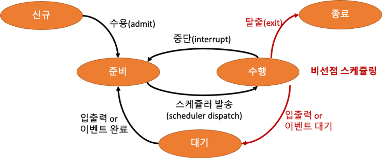 대기 : -프로세스 도중에 I/O 작업이 필요하여 I/O 작업을 수행하는 상태 -이 때 CPU는 I/O를 기다리며, 다른 프로세스를 수행한다. -대기 상태가 끝나면 프로세스는 다시 준비 상태가 되고, 잠시 후 다시 수행 상태로 변한다. ****여기도 이미지 가져가기 ****